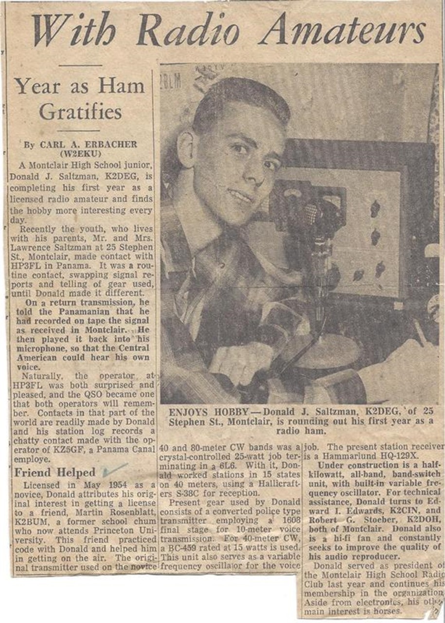 Don was first licensed at the age of 15 as a Novice in 1953 (KN2DEG) in Montclair, NJ. There was an article about him in the local paper. He went on to get General, Advanced and finally Extra Class licenses, He was also very proficient at CW having been an instructor during his military service as a sergeant in the Army National Guard for eight years.